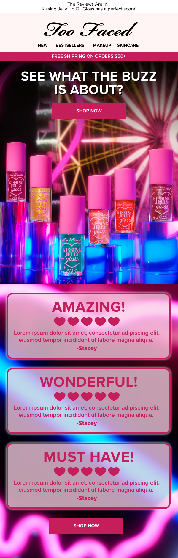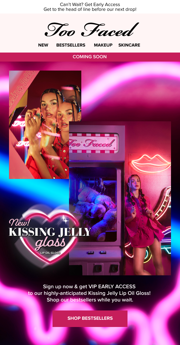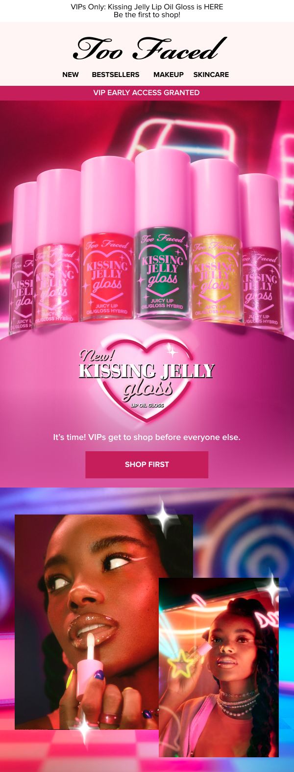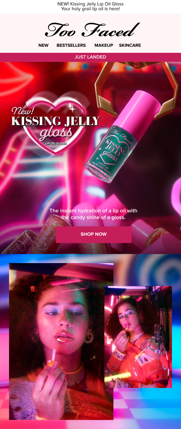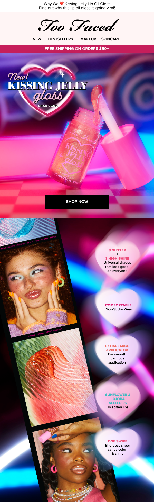 Digital designs for Too Faced's latest innovation: Kissing Jelly Lip Oil Gloss. Included CRM Emails and Banners for launch of their new collection.